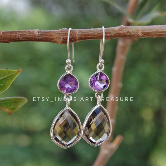 Amethyst -Smoky Quartz Long Dangling Earrings