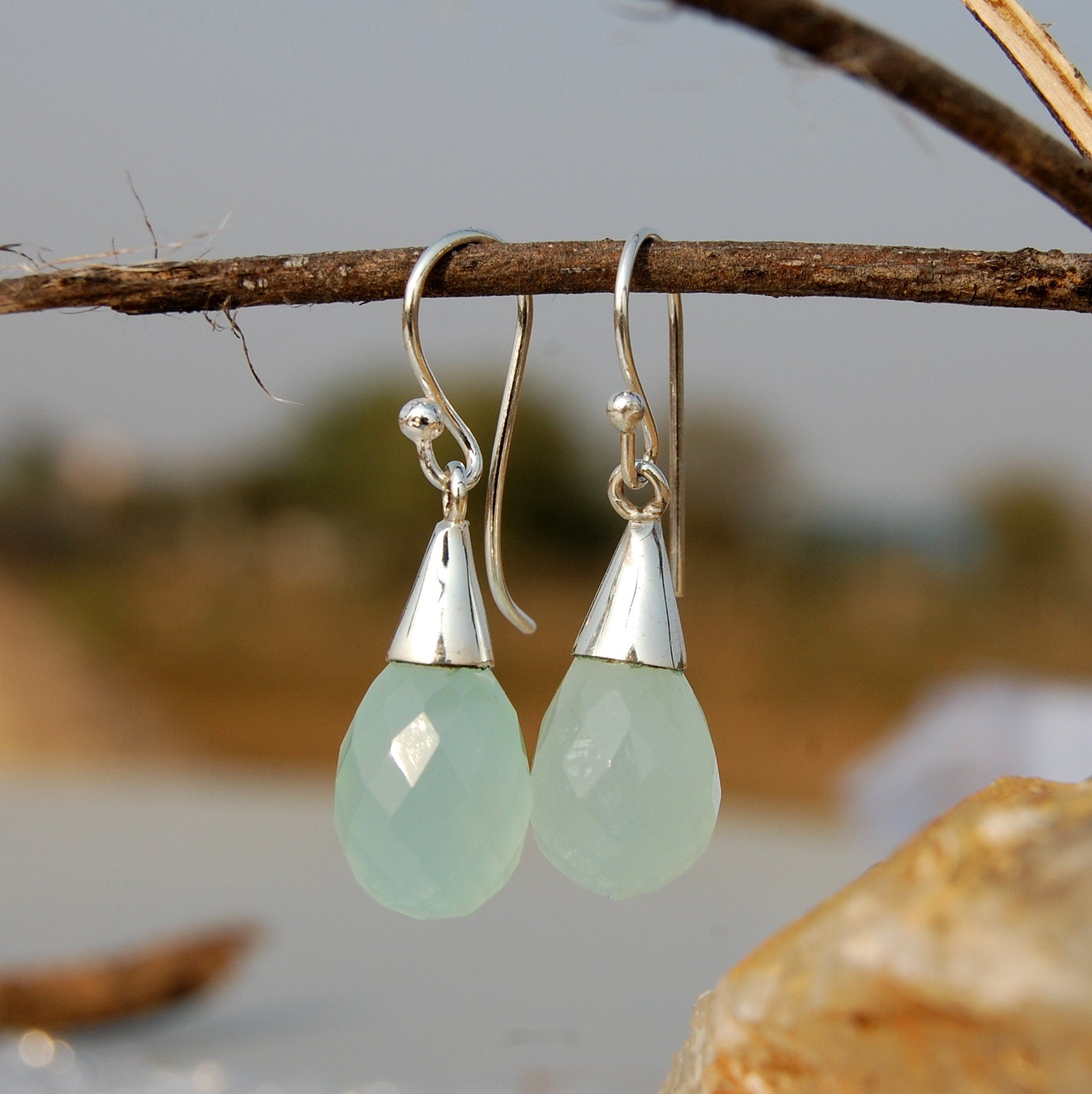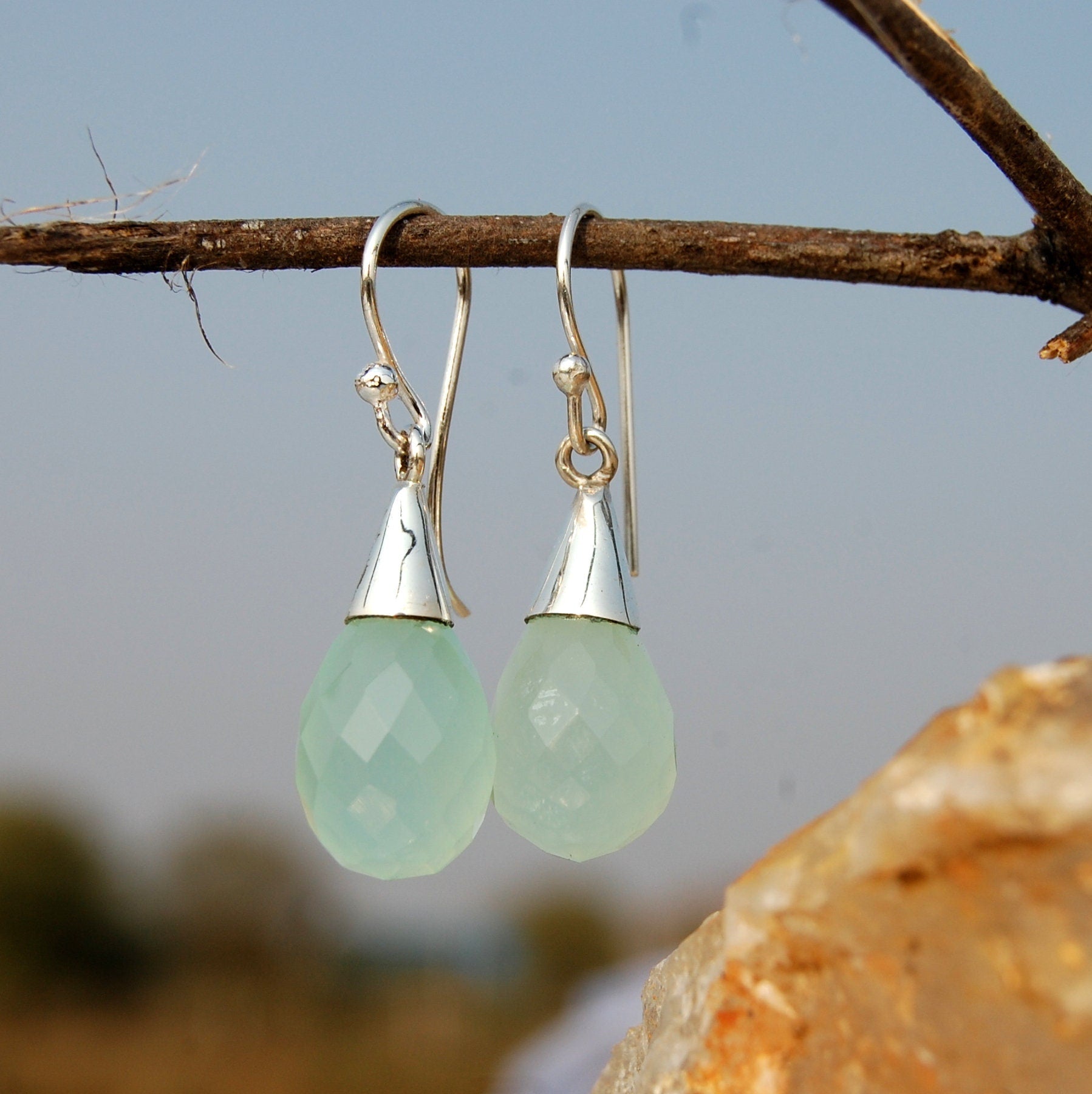 Aqua Chalcedony drop shape stone is faceted all around. Stone is set with all handmade 925 sterling silver Setting only on the top which lets the stone expose its faceted more than a normal bezel setting. Stone is all natural and its size is 13mm x 10mm and drop total length is 19mm