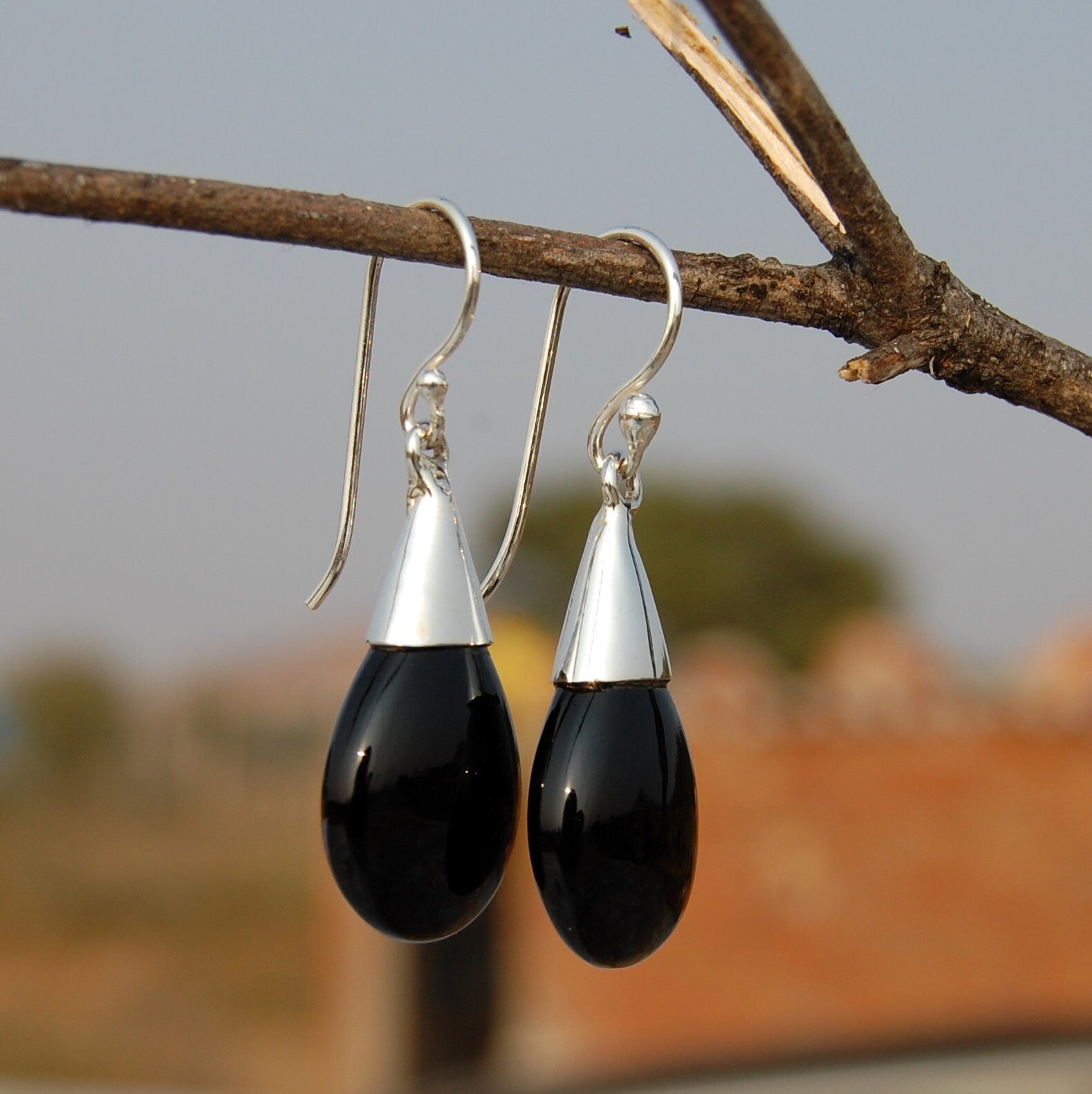 A smooth Natural Black Onyx Pear Shape Stone is set with all handmade 925 sterling silver Setting only on the top. Stone is all natural and size of the stone is 15mm x 13mm and drop total length is 25mm