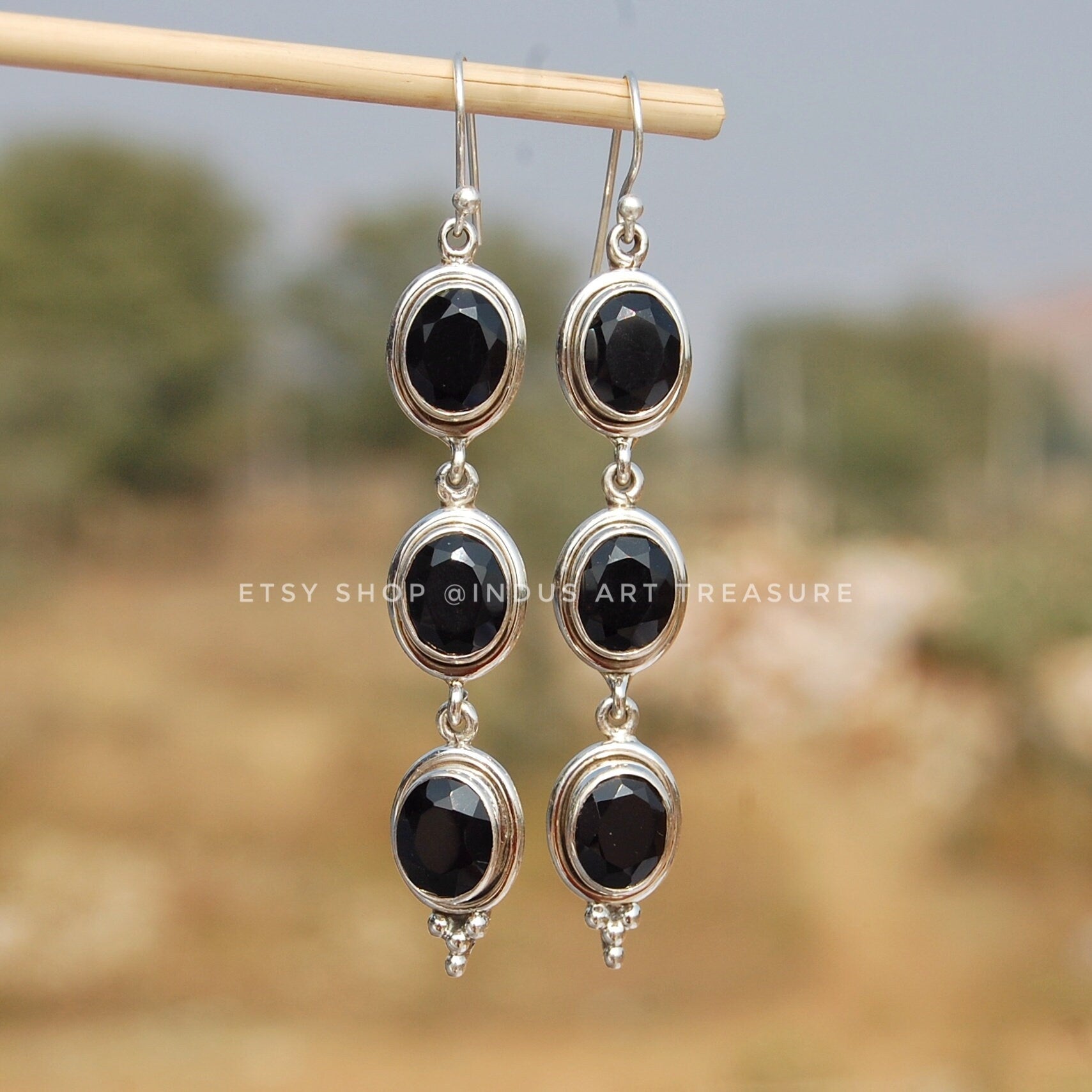 Product : Elegant Black Onyx three stone Long Cut Earrings.