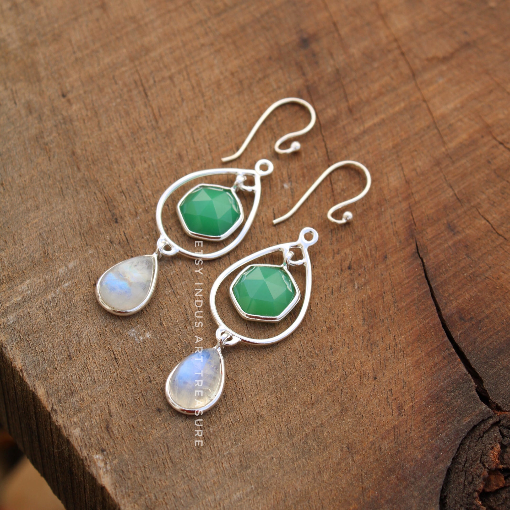 Product : Natural Green Jade -Moonstone Statement Earrings, Green Stone Jewelry, Happiness Stone, Green Jade, Gifts for Women, Anniversary Gift for Wife, Rainbow Moonstone Earrings.