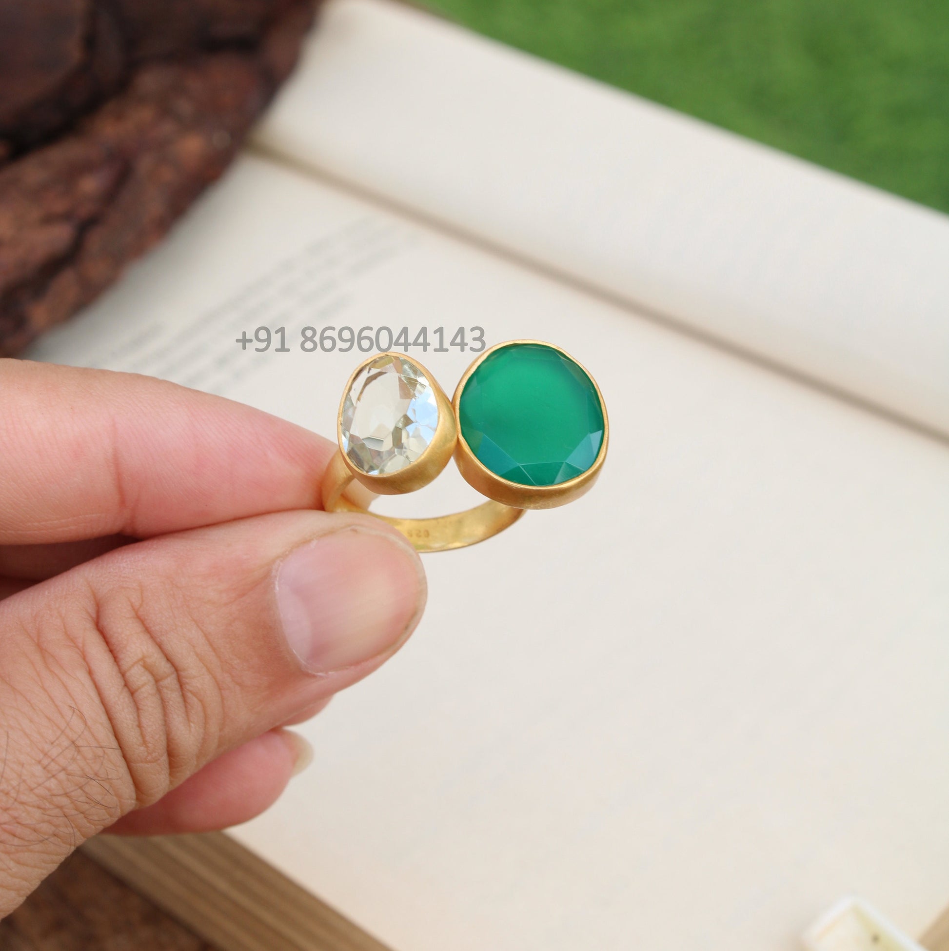 Product : Natural Green Onyx - Clear Crystal Gold Ring for Special One/ Gold Plated 925 Sterling Silver Ring/ 18k Gold Rings for Women/ Green Gemstone Ring Jewelry/ 18k Gold Unisex Ring/Wedding Anniversary Gift Ring for Her.