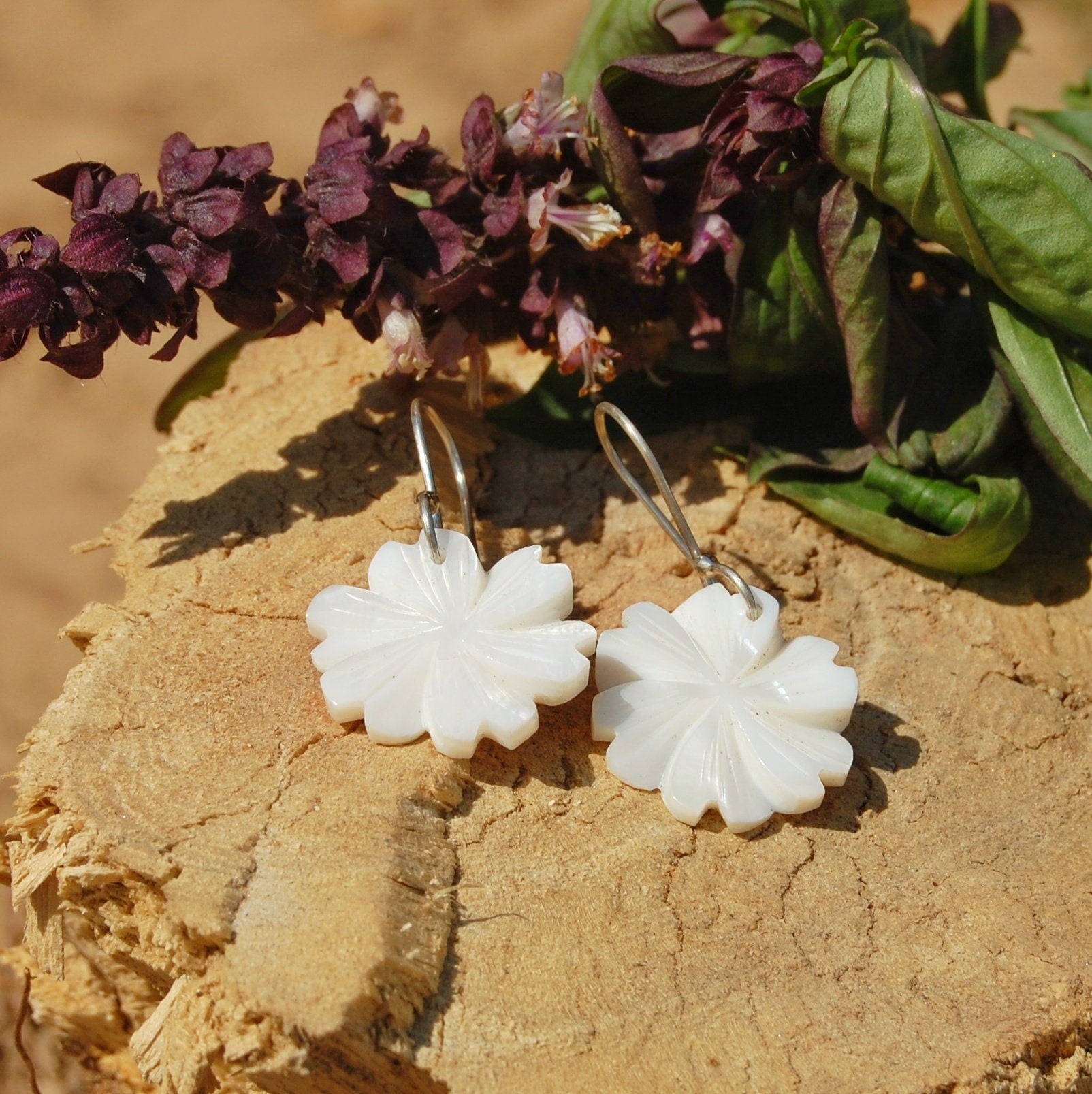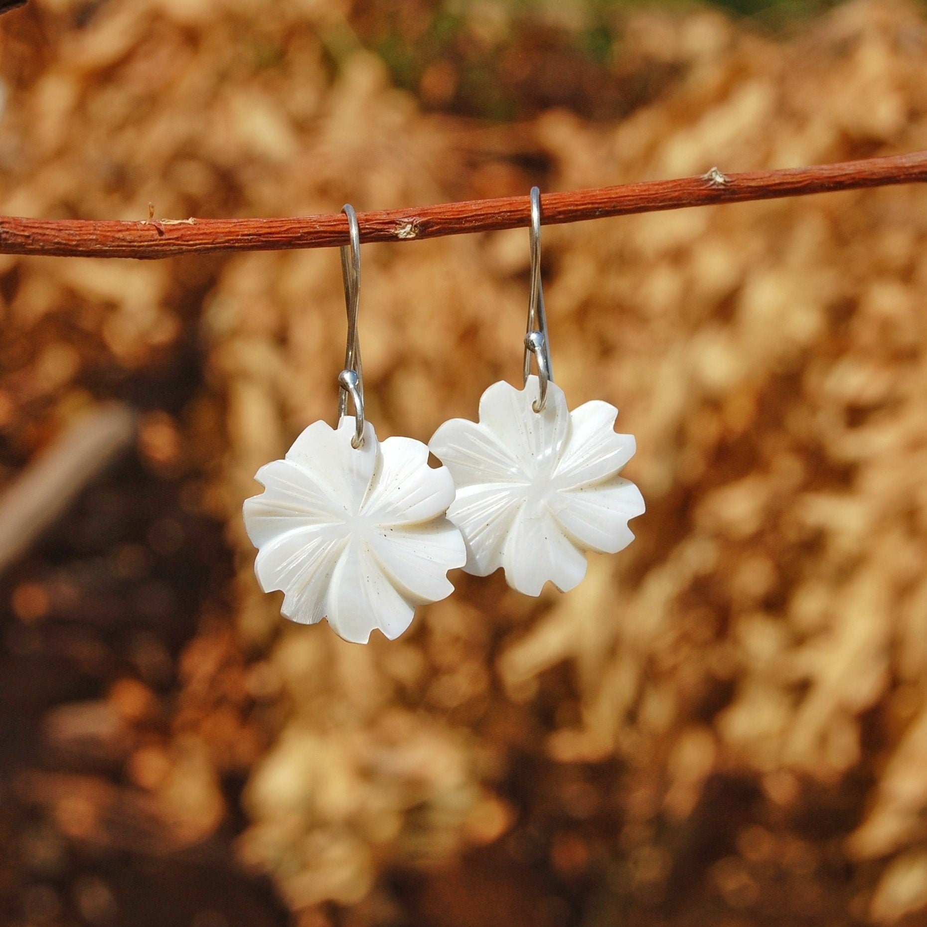 This is very simple but beautiful pair of earrings. Flower is carving of Mother of pearl and stone is natural. Size of flower is 20mm round. Metal is 925 sterling silver and this item is all handmade.