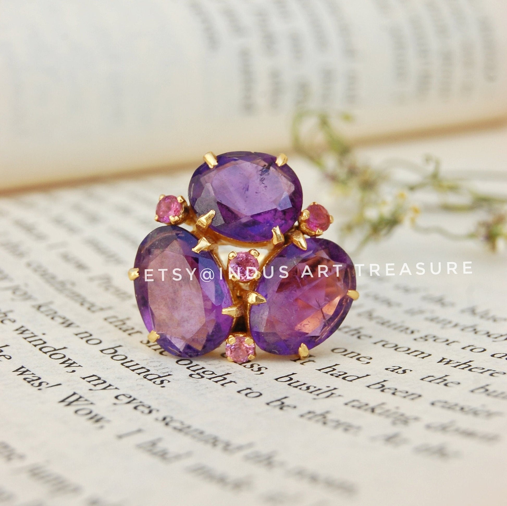 Product : Pink Tourmaline & Amethyst Gold Plated 925 Sterling Silver Delicate Ring, Statement Ring, Wedding Ring Jewelry, Engagement Ring, Propose Ring, Fine Gemstone Ring,Amethyst Ring, Pink Tourmaline Ring, Anniversary Gifts.