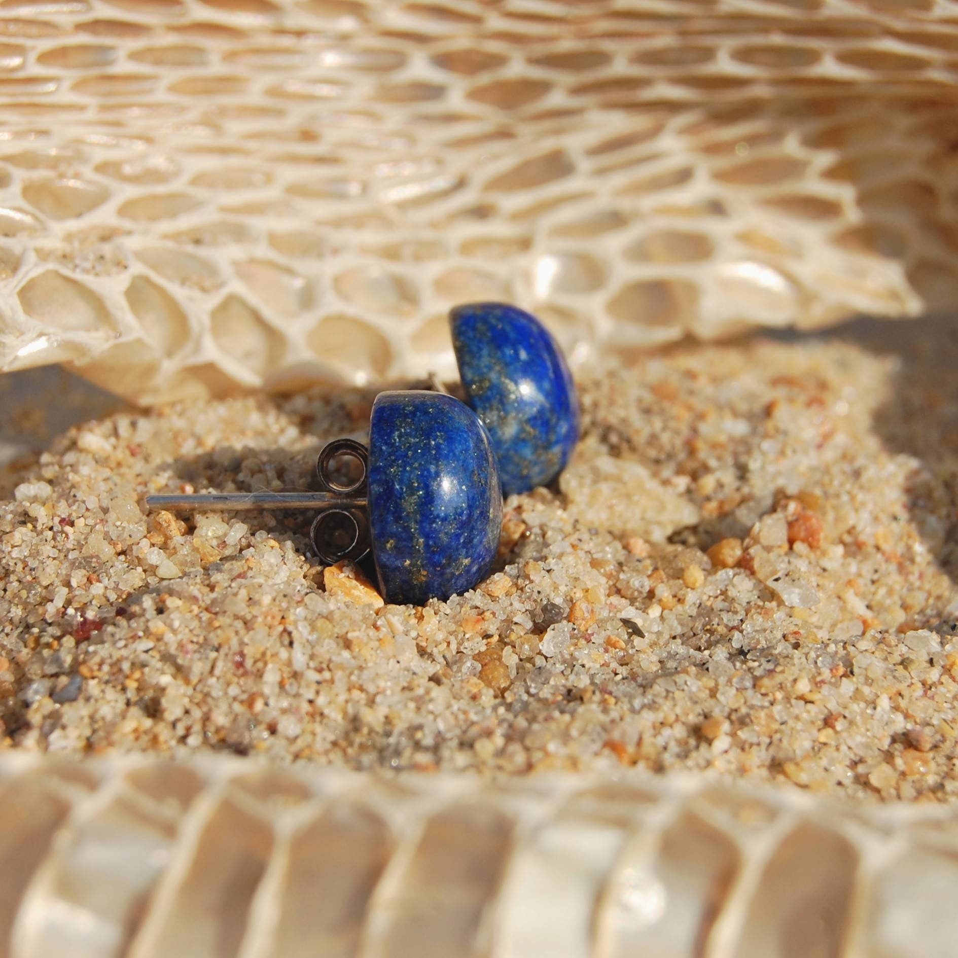 Beautiful Round Lapis is drilled on the back and push back closure is fit directly on the stone. These earrings would look great as only the stone without any silver setting will be visible on the ear. You can wear these stud earring daily, these are very light weight and good quality.