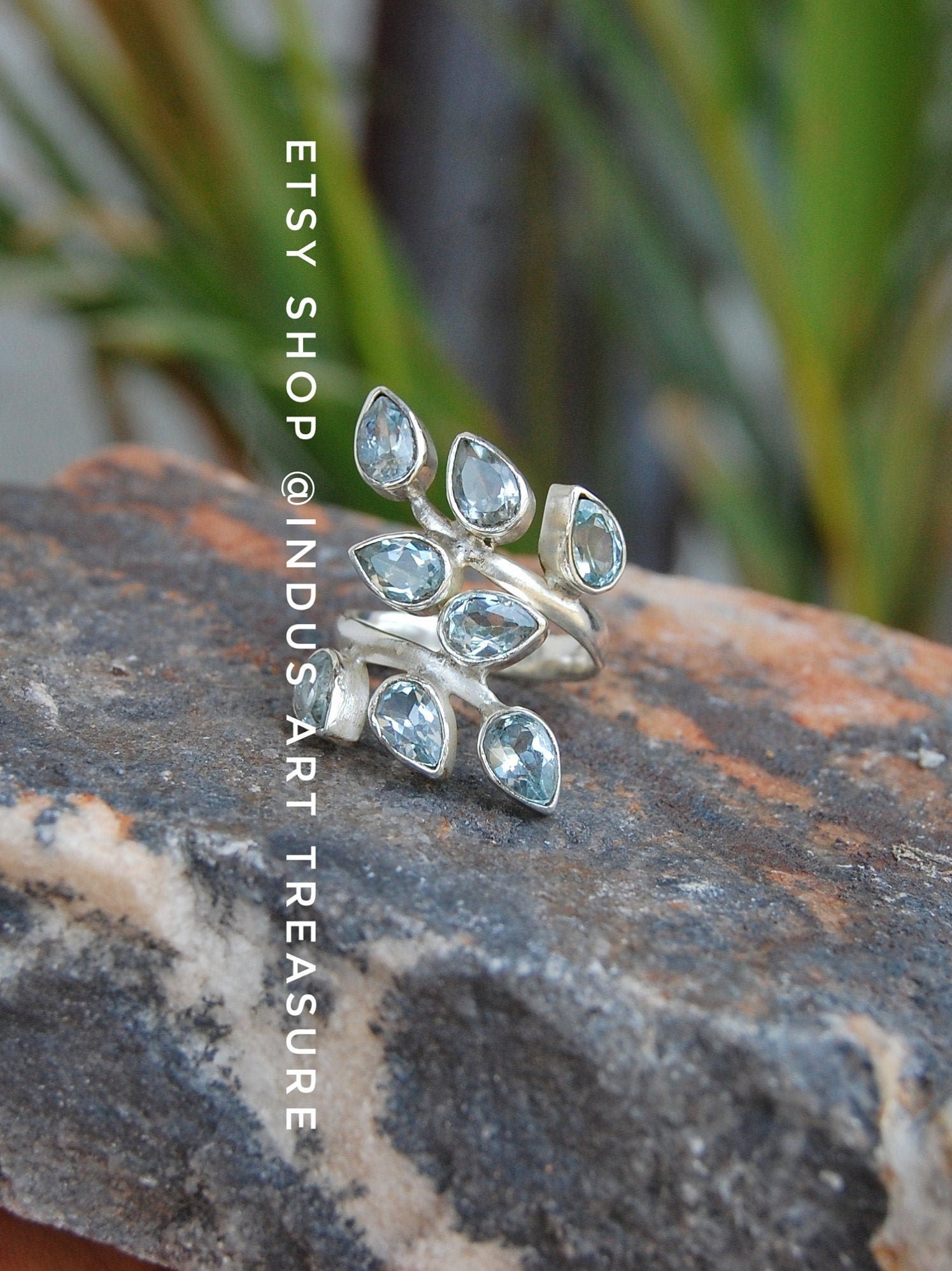 Product : Nature Inspired Blue Topaz Leaf Branch Dainty Ring/ 925 Sterling Silver Ring/ November Birthstone Ring/ Layering Leaf Ring/ Nature Jewelry/ Blue Topaz Ring/ Gift for Wife/ Birthday Gift to Her.