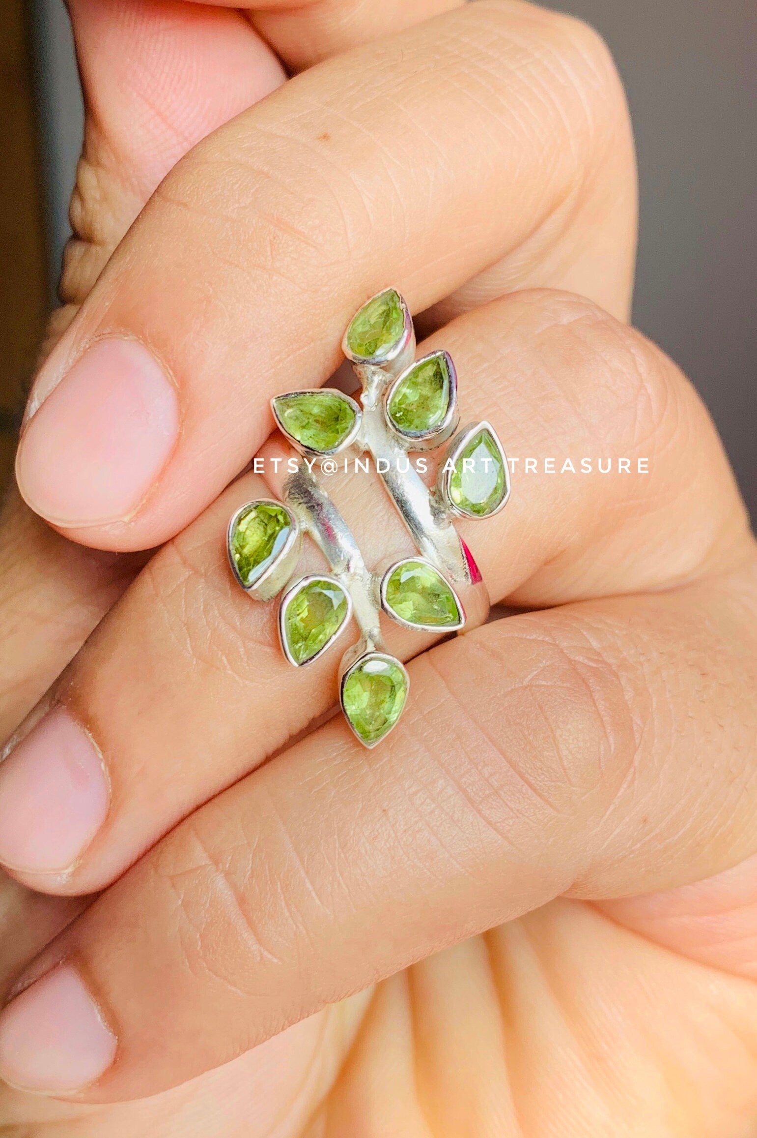 Product : Olive Green Peridot Leaf Ring for Women, August Birthstone Ring, 925 Sterling Silver Ring, Twig Ring Fashion, Peridot Ring, Indian Handmade Ring Jewelry, Gifts for Girl, Green Gemstone Ring.