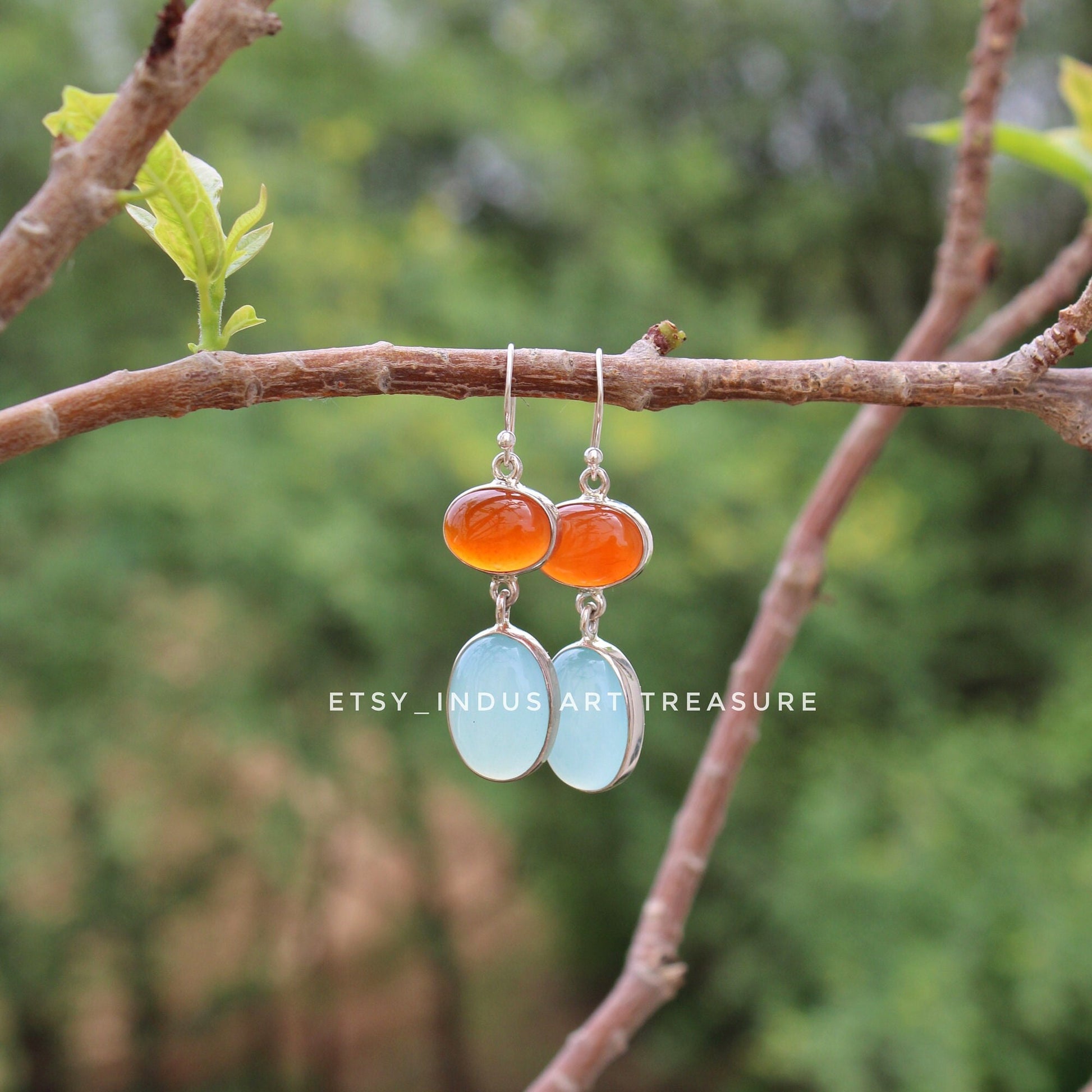 Product : Natural Carnelian - Aqua Chalcedony Earrings for Her/ August Birthstone/ Carnelian Earrings/ 925 Sterling Silver Earrings/ Birthday Gift for Her/ Valentines Gift/ Mood Earrings/ Gift for Mom.