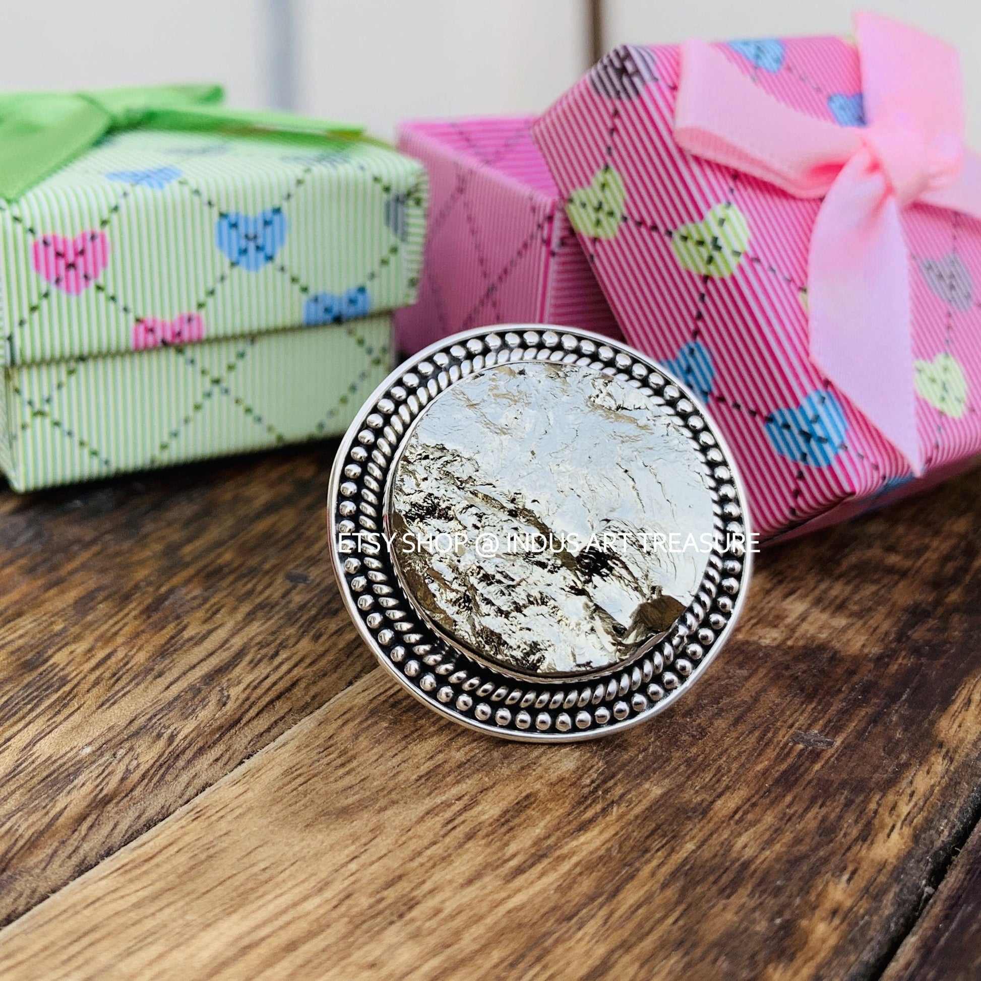 Product : Natural Pyrite Rough Bohemian Statement Ring - One of a kind