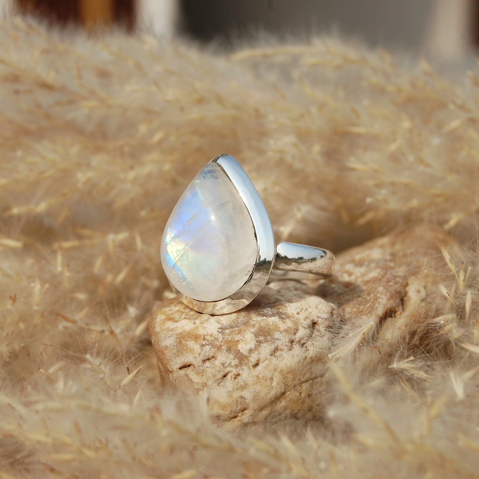 Product : Natural Rainbow Moonstone Pear Cab Cocktail Ring.