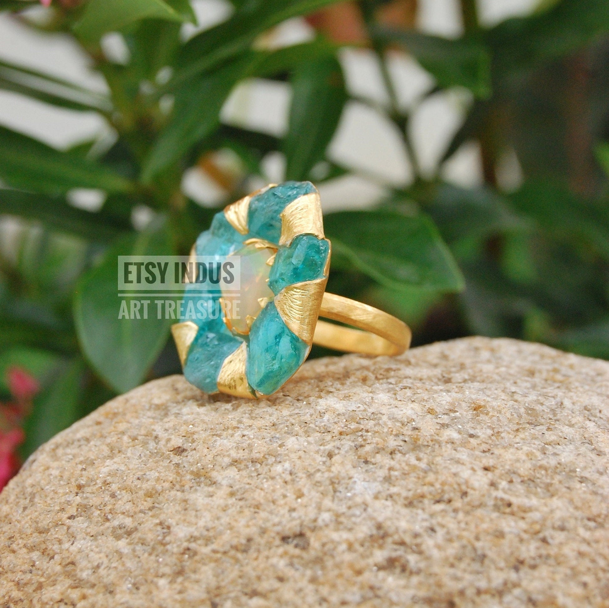 Product : Raw Apatite Crystal- Natural Opal Gold Plated Delicate Floral Ring, Statement Gold Ring, Wedding Ring Jewelry, Engagement Ring, Floral Propose Ring, Blue Gemstone Ring, Apatite Ring, Healing Fire Opal Ring, Perfect Anniversary Gift for Women .