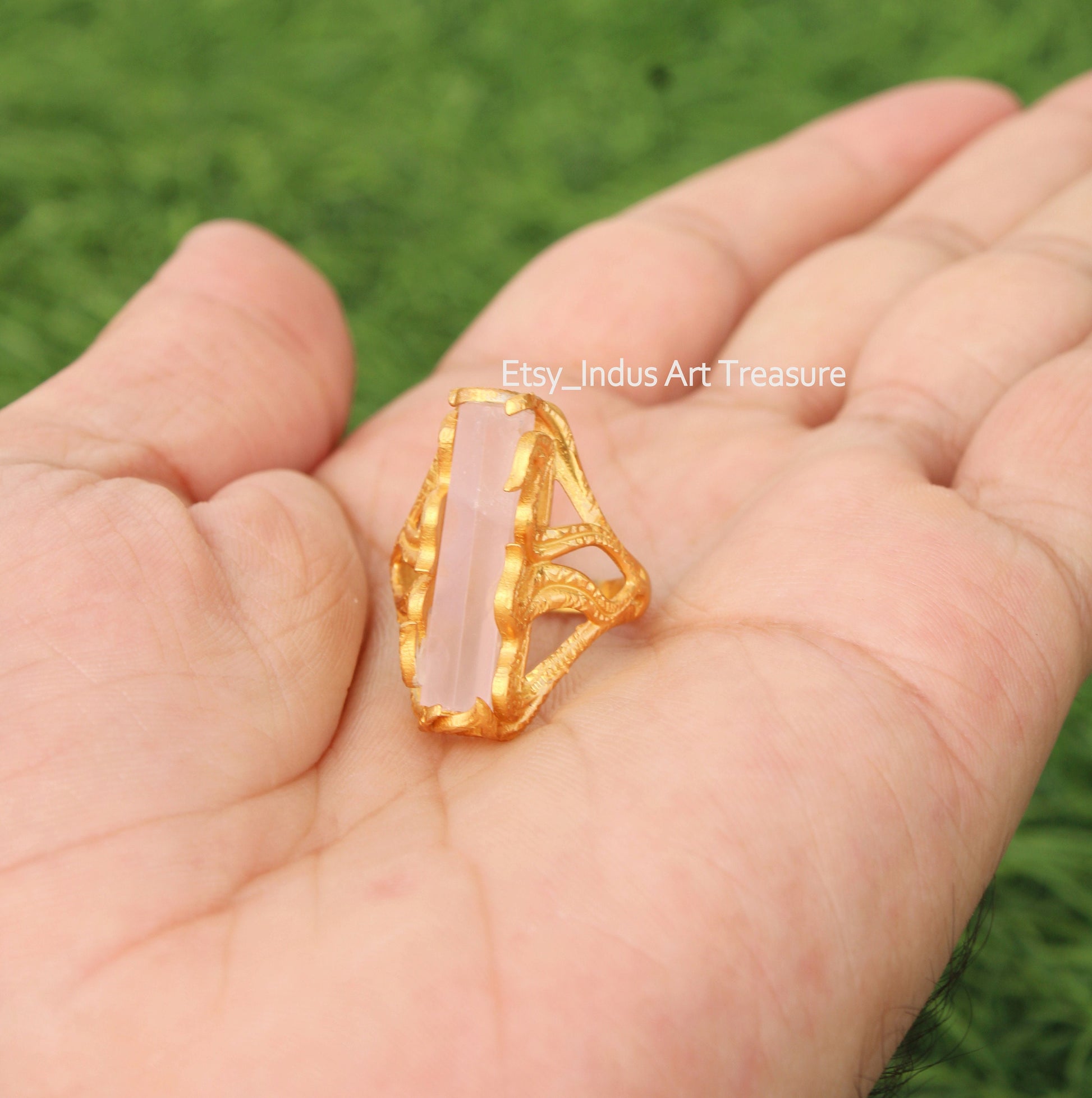 Product : Natural Rose Quartz Gold Plated Ring/ Vintage Style Umisex Ring/ 18k Gold Plated 925 Sterling Silver Ring/ Bridesmaid Ring/ Wedding Ring Jewelry/ Propose Rings for Women/ Huge Rose Quartz Gemstone/ Anniversary Gifts.