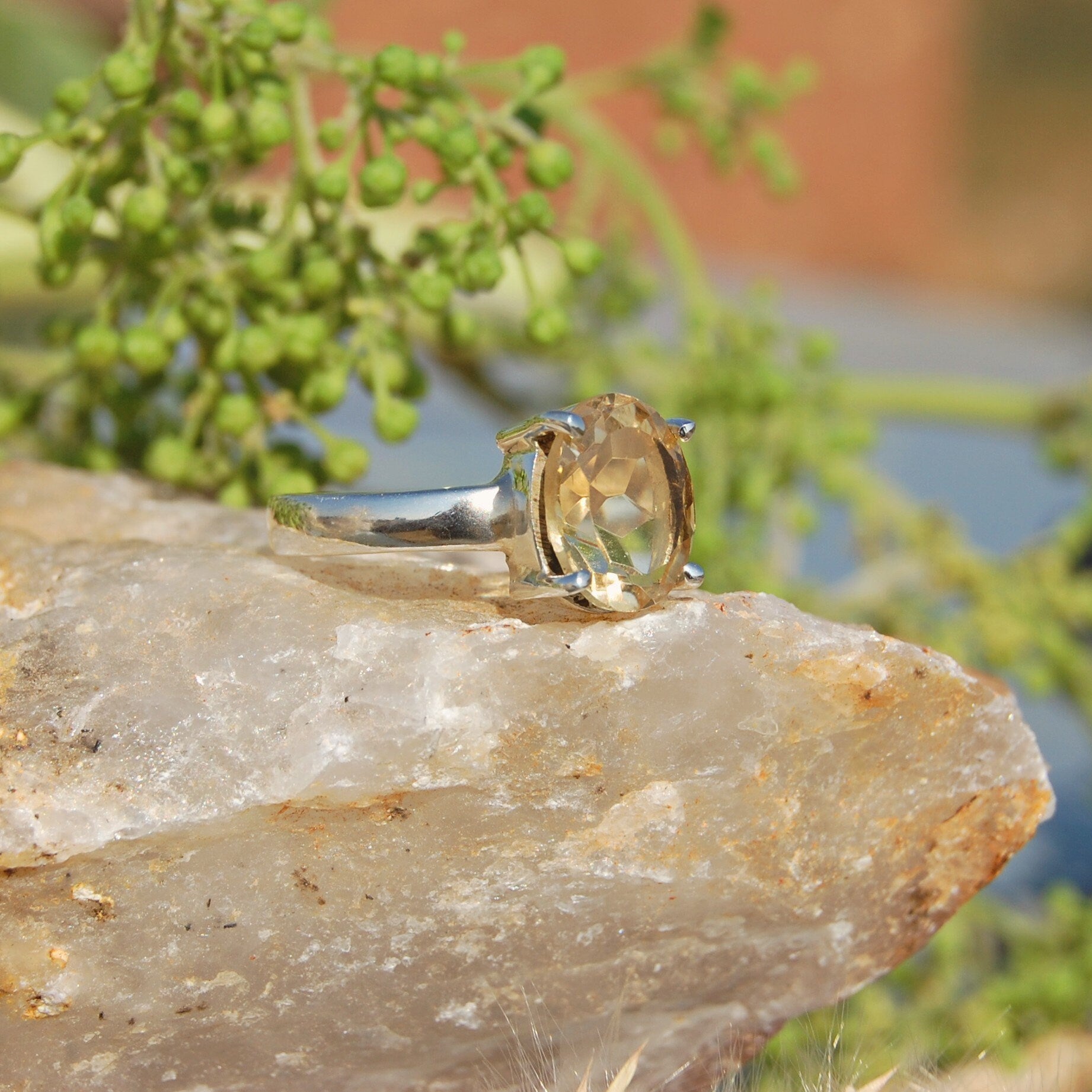 Natural Yellow Citrine is set in prong setting with strong Half round band. Metal is 925 sterling Silver.